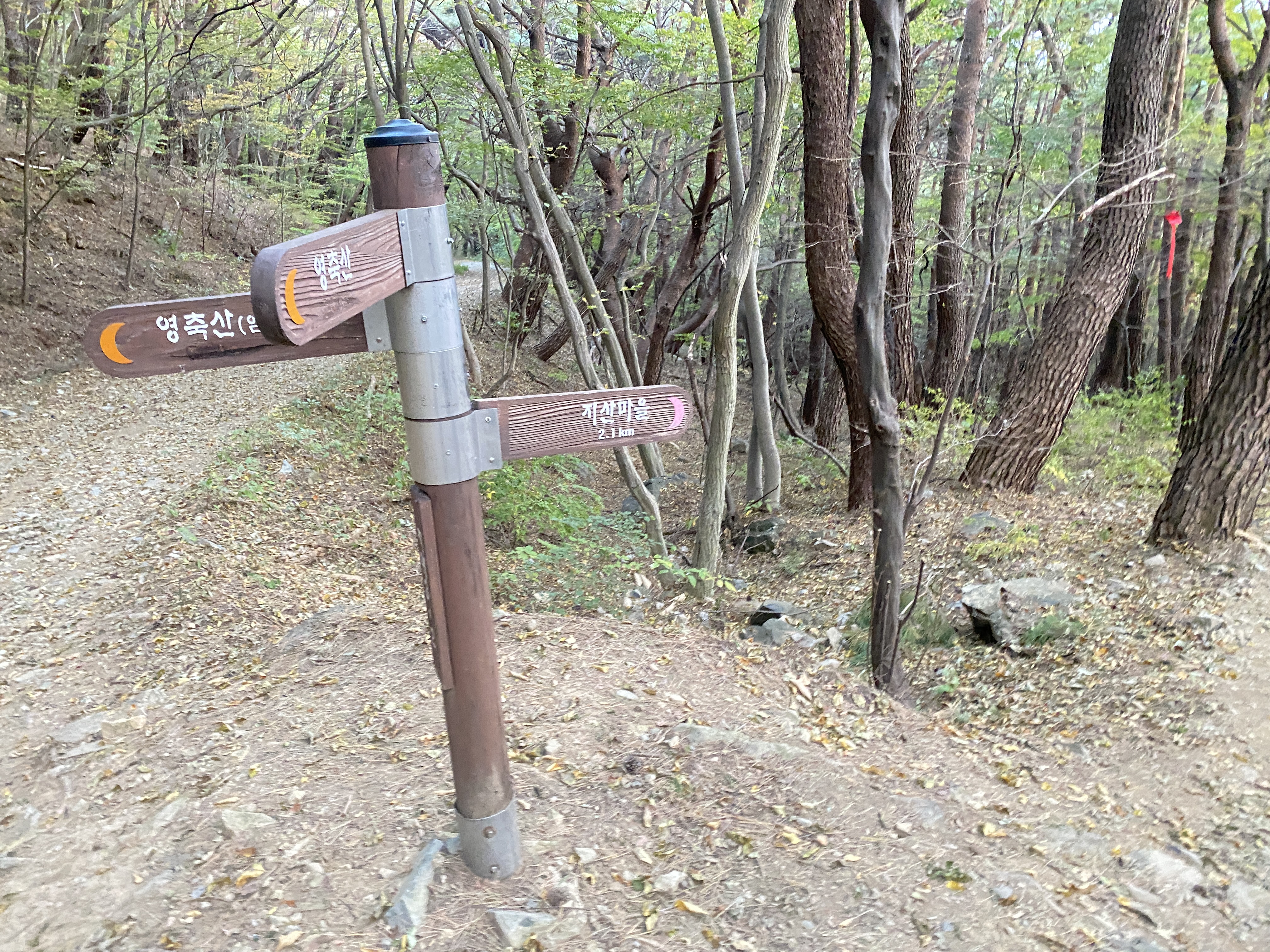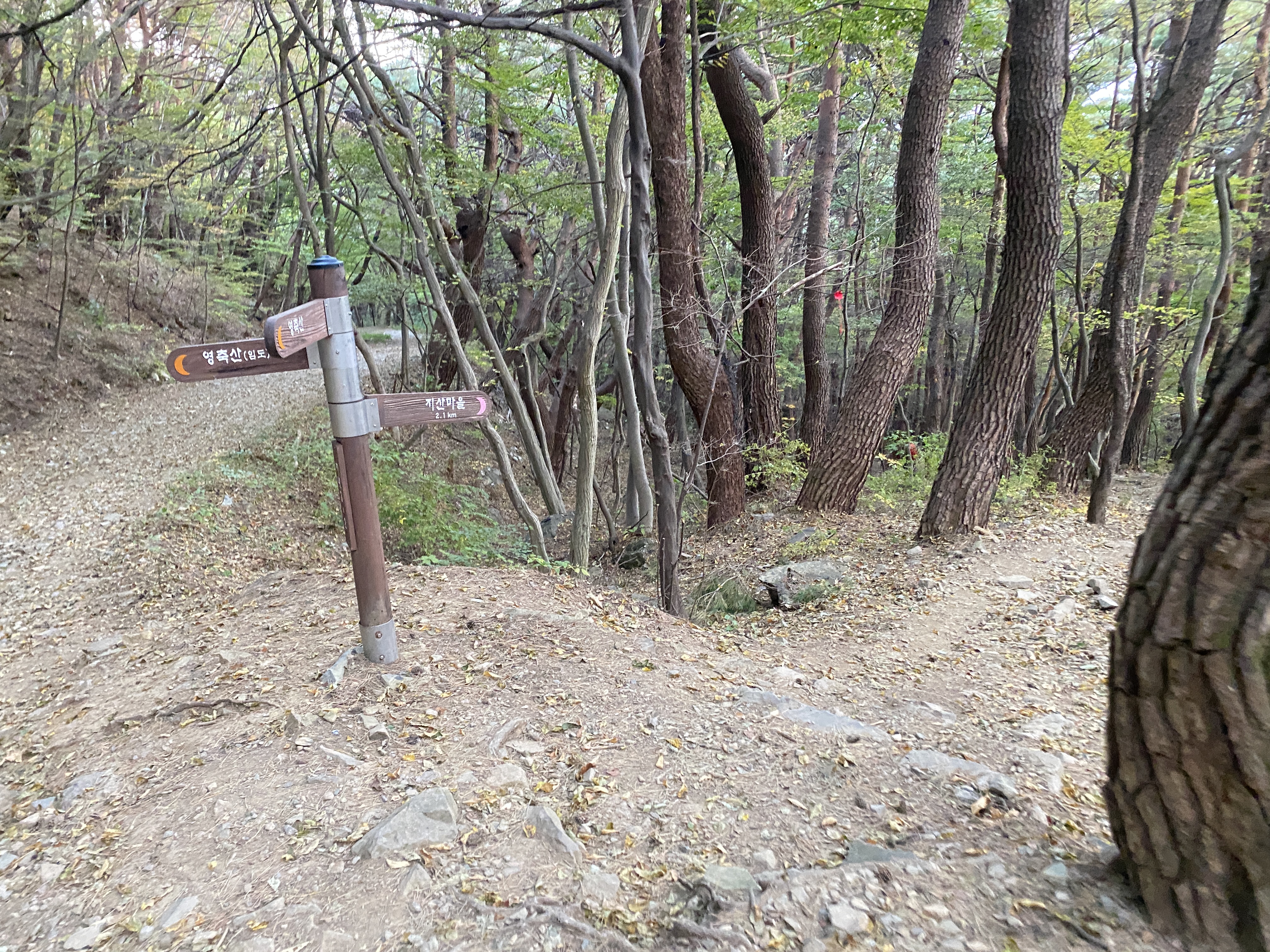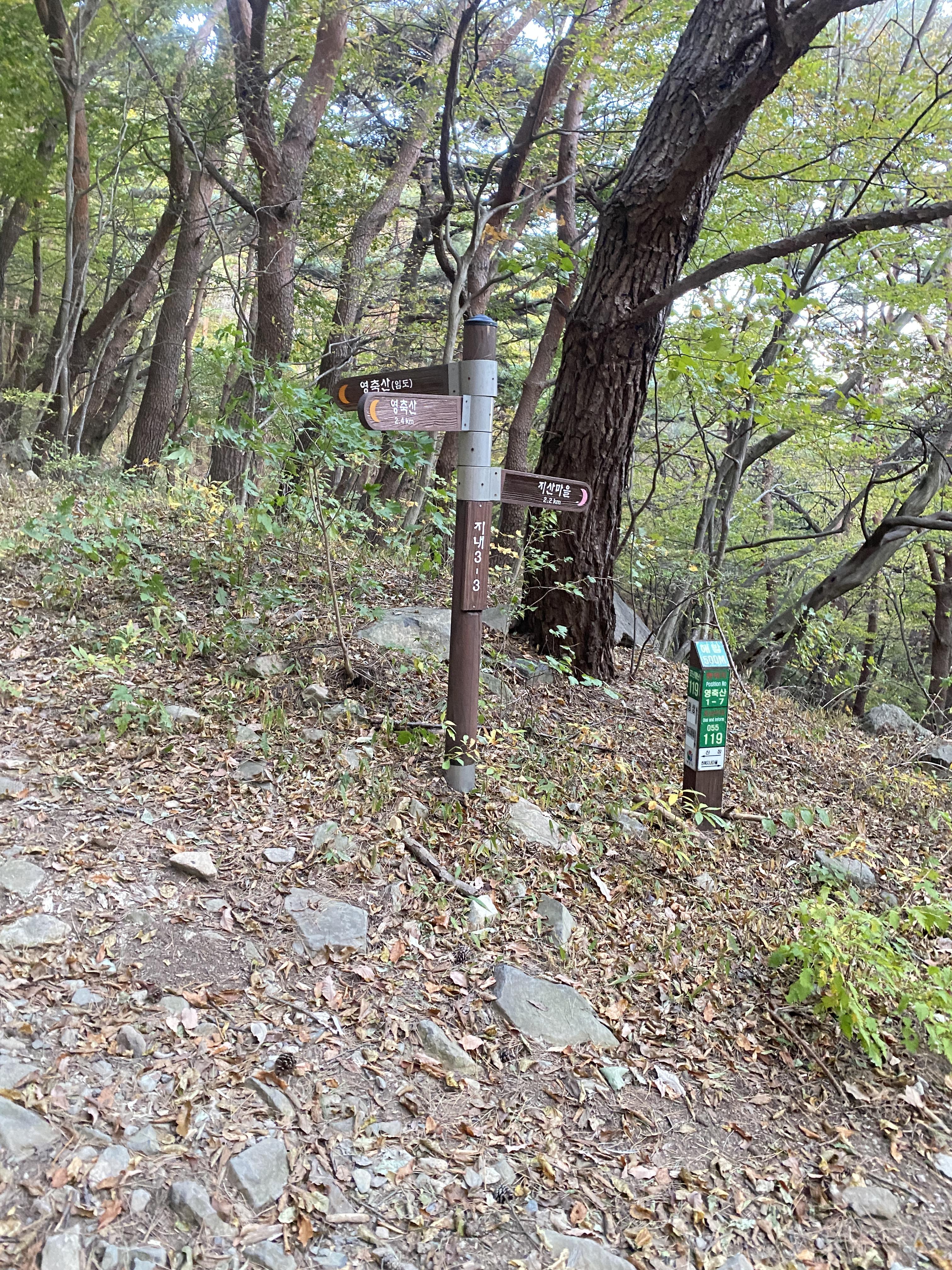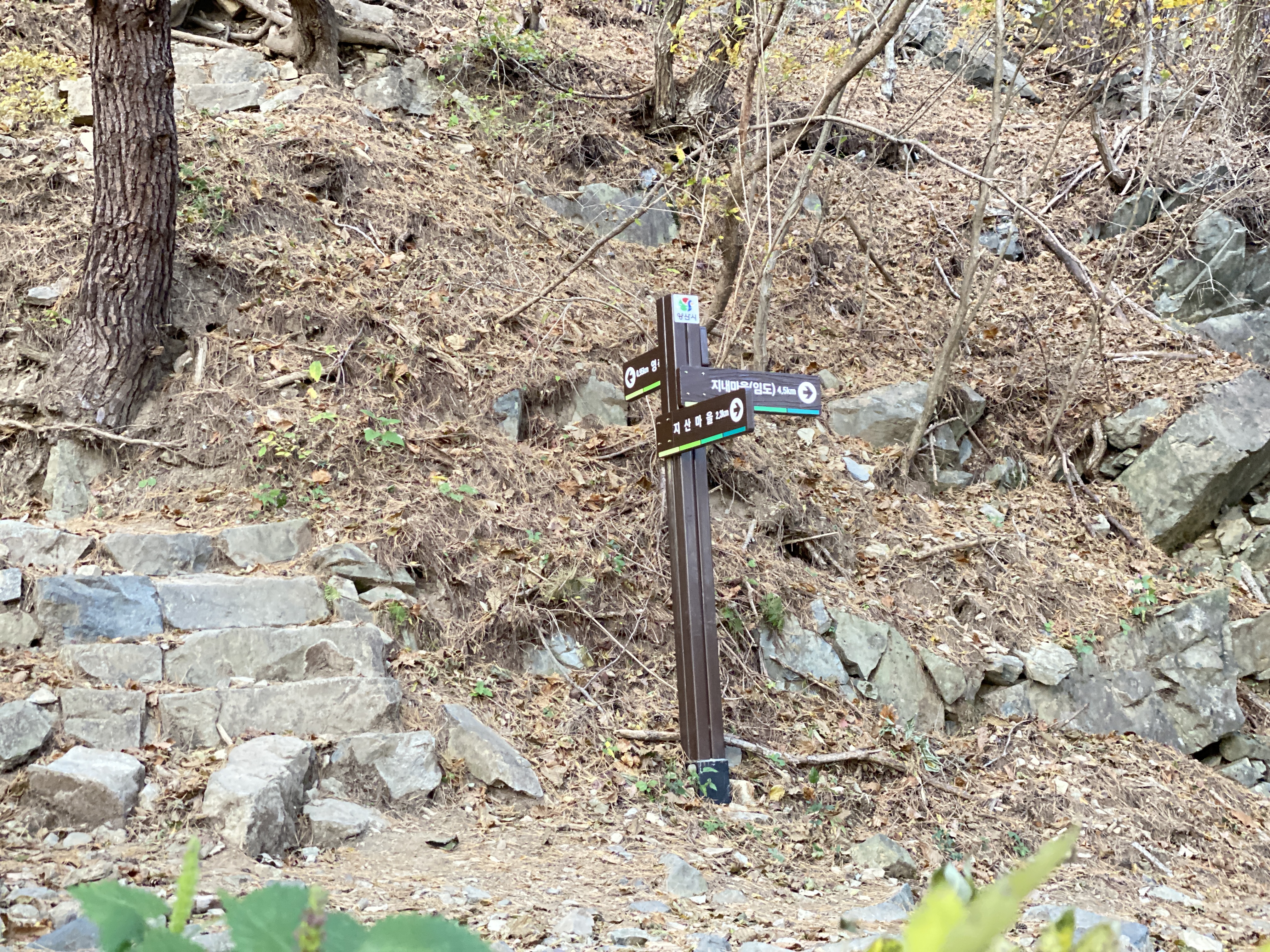 지산마을은 이정표 방향으로(비포장도로) 내려가야합니다.