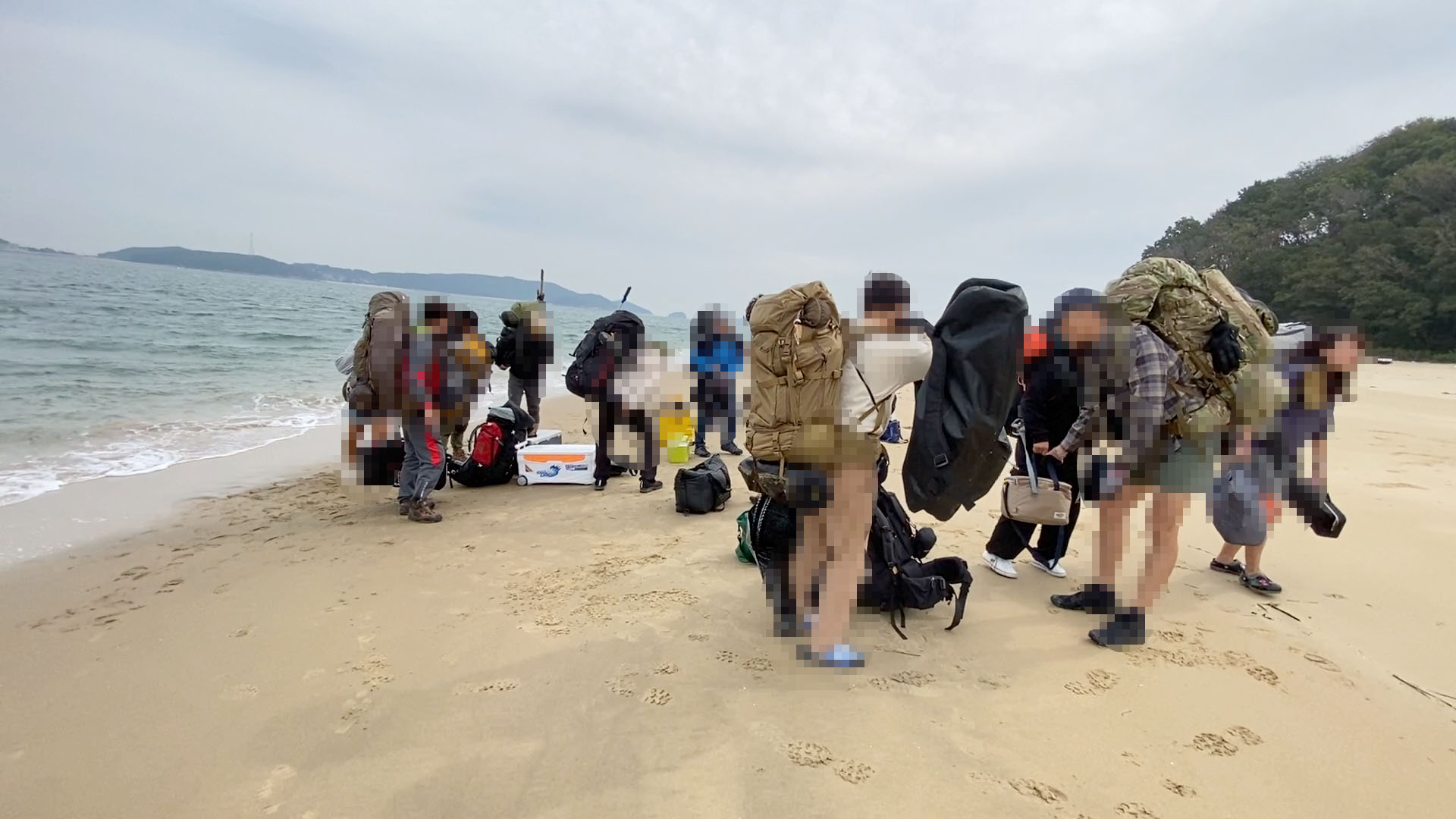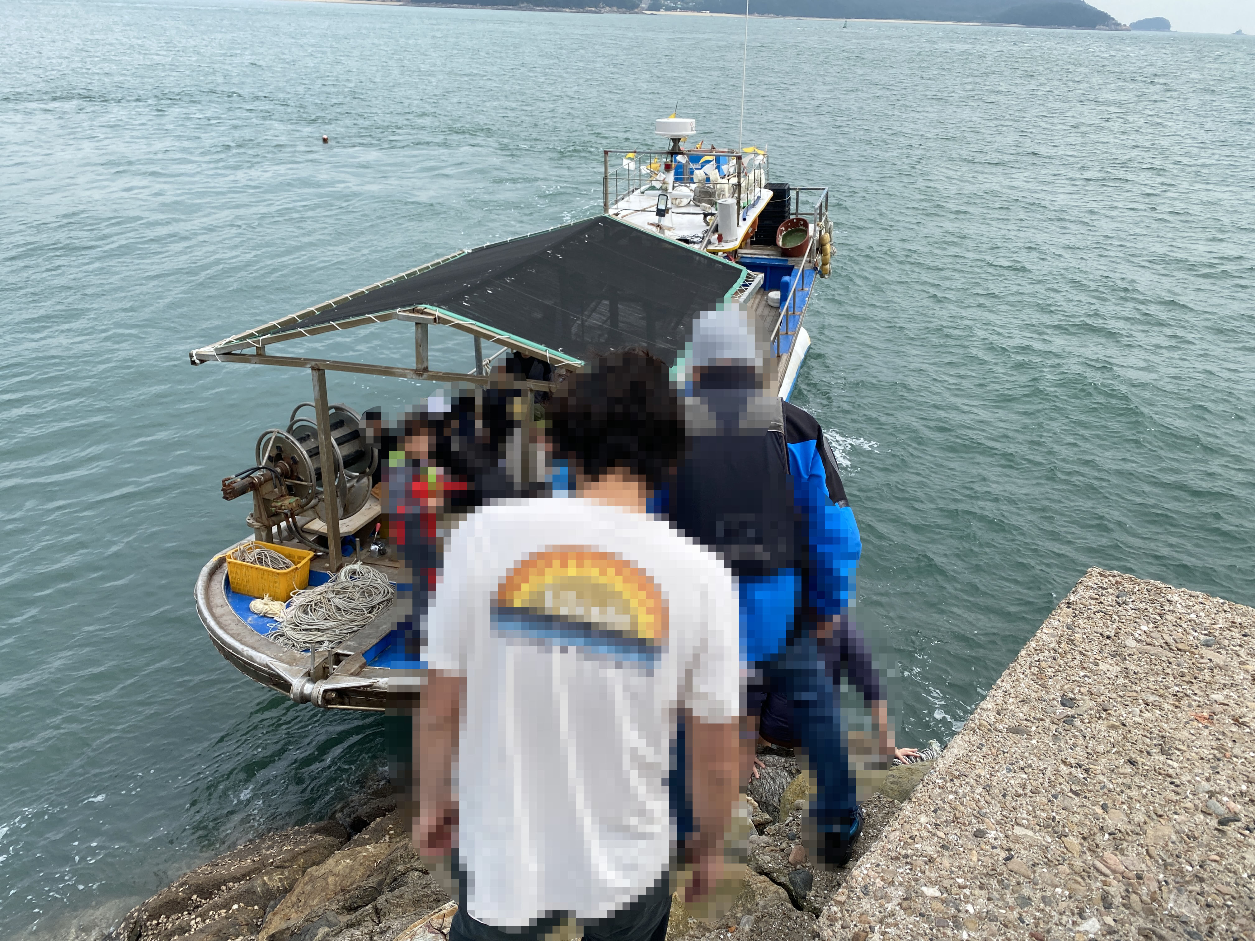 휴일에 맞춰 들어가는 인원이 20명이라 작은 선외기에는 짊을, 큰 배에는 사람을 싣고 이동했다.