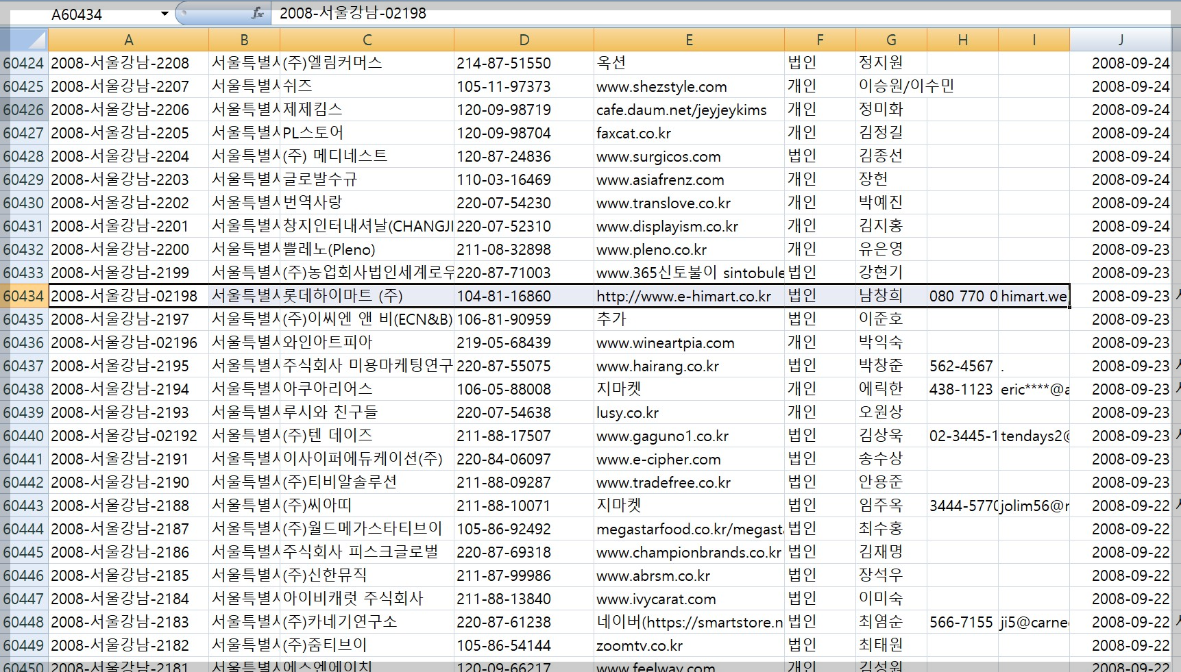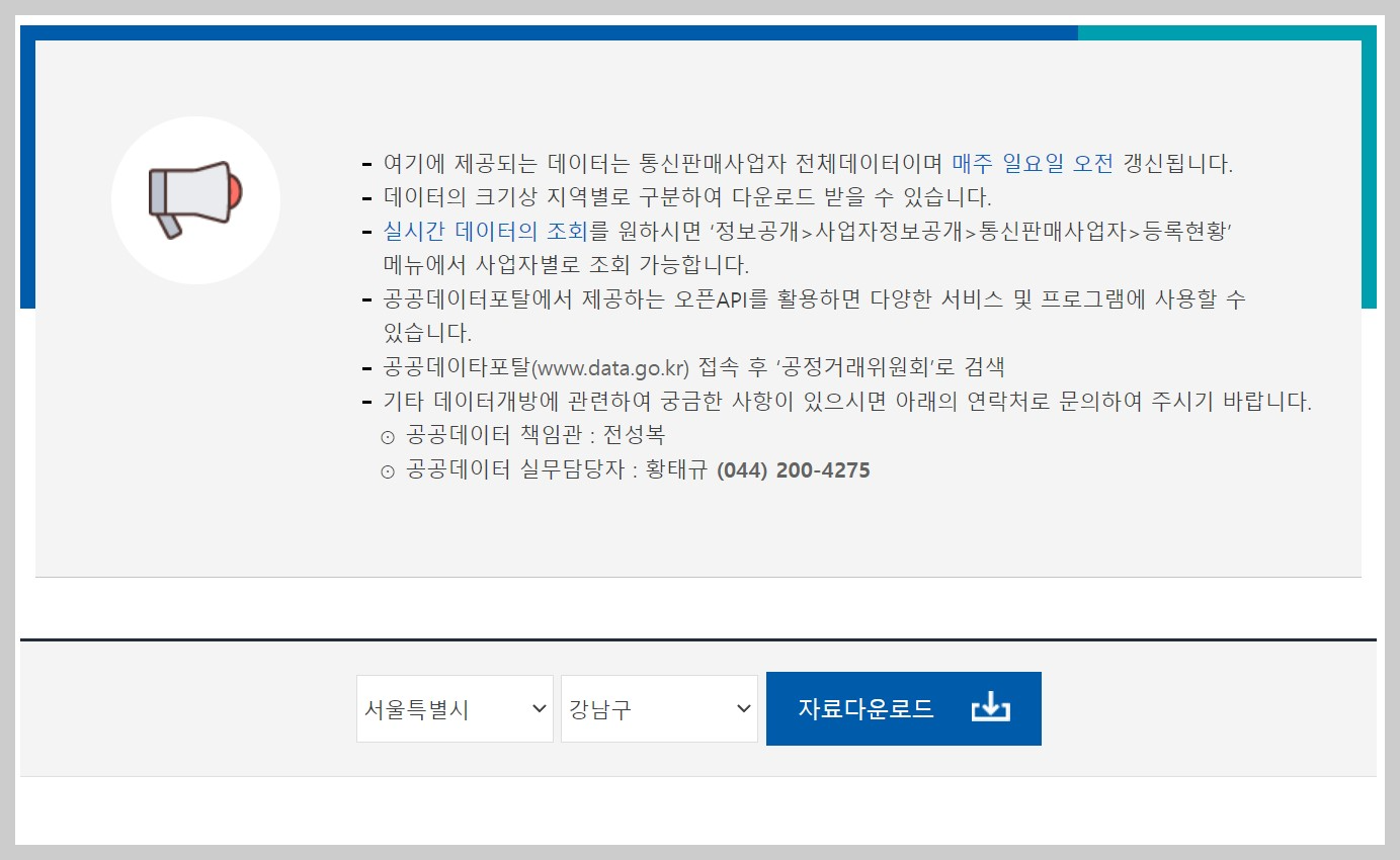 자료를 다운 받아 통신판매업 및 사업자번호를 엑셀에서 찾을 수 있다.