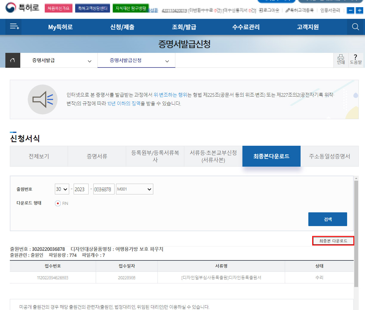 * 특허로 로그인 > 조회/발급 > 발급신청 > 최종본다운로드 "발급신청" > 다운로드