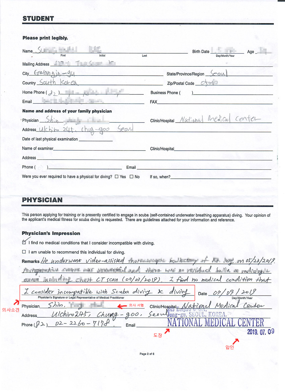 PADI 다이빙 교육을 받기 전에 진술서를 작성하는데, 해외의 경우 영문진술서 양식에 영문으로 "스킨스쿠버 다이빙에 문제가 없다"라고 명시를 해줘야합니다. 또한 병원에서 허가한 압인+도장를 받아야 서류 승인이 가능합니다.(병원에서 압인 2만원 소요됨)