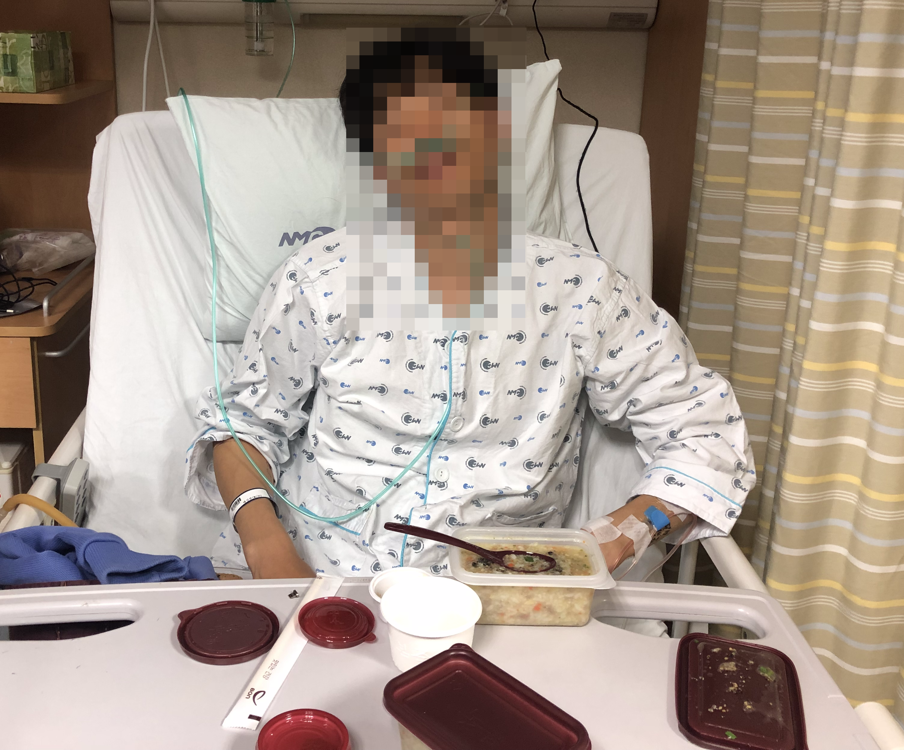 응급 시술 후 수술을 받게 되었는데, 폐에 구멍이 생겨 숨쉴 때 폐에서 빠진 공기가 폐를 눌려 발생하는 폐 눌림 현상으로 숨을 쉴 수 없었던 거였어요. 그게 기융 이라는거래요.
